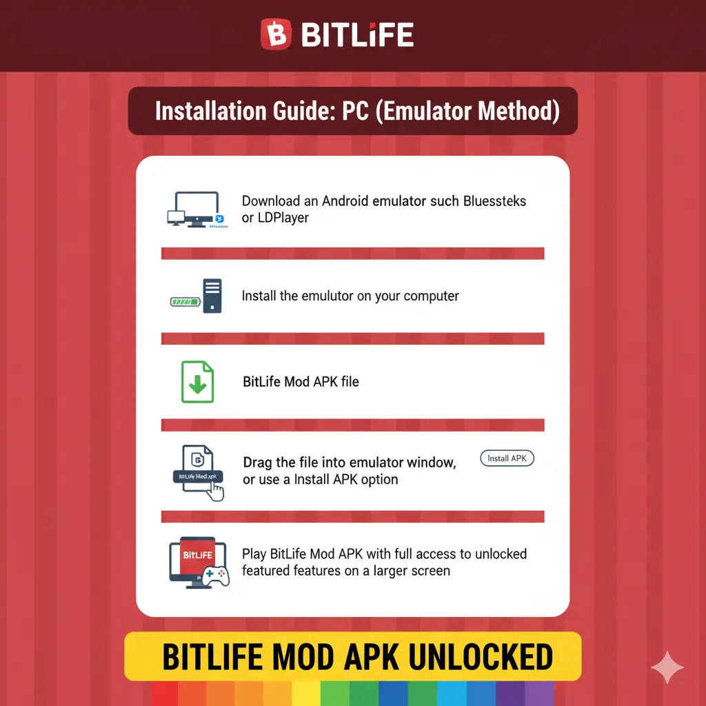 - Play BitLife APK with full access to unlocked features on a larger screen.